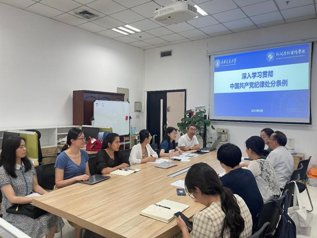 交流环节,师生党员纷纷表示,要将党纪学习教育的感悟转换为坚守岗位的源动力,努力把他律要求转化为内在追求。学院党委副书记、国际传播系教师吴锋首先肯定了本次党课学习的重要意义,指出要在全面知纪中校正言行,把加强作风建设作为终身课题。机关党支部书记范晓莹谈到应当把党的政治纪律作为最根本的纪律,强化制度建设,以严明的纪律服务学院各项工作有序开展。国际传播系主任刘婵君强调通过党纪学习深刻意识到坚定信念、笃行守纪的重要意义。系所师生将本着高度负责的态度严守各项纪律、勇于担当,营造良好的育人环境。国际传播系支部书记刘彦表示未来国际传播系将继续加强学习,将党纪学习教育与巩固扩展主题教育成果、业务发展紧密结合,持续汇聚师生团结奋进的凝聚力和自强不息的行动力。