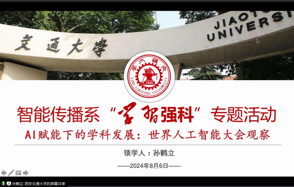 8月6日上午,智能传播系在线组织召开第二次“学习强科”业务研讨活动,学院副院长、新媒体系教授孙鹤立领学“AI赋能下的学科发展:世界人工智能大会观察”,院长汪文斌参会。会议由系主任马晓悦主持。