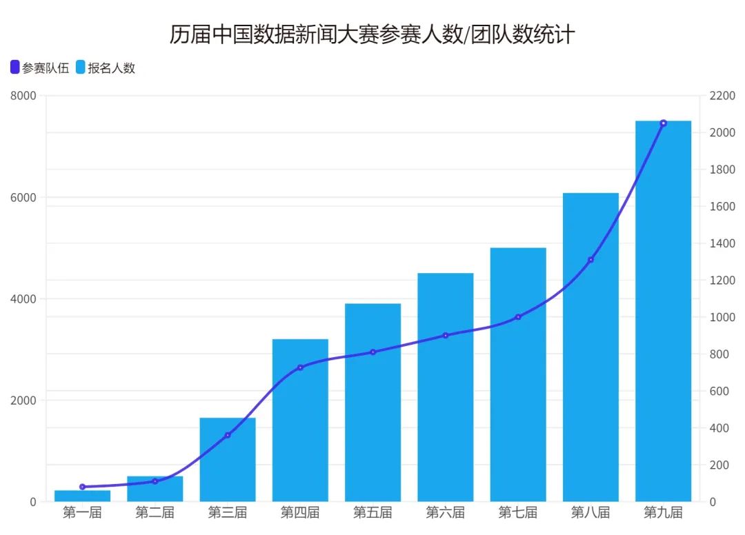 联合全国二十余所新闻传播院系举 办的第九届中国数据新闻大赛报名结束。据组委会统计:本届大赛共吸引了来自380余所高校、20余家媒体机构的2000余支队伍、7500余人报名。本届大赛的参赛学校数量、参赛队伍数量、参赛人员数量创历史新高,参赛选手跨专业、跨领域合作特点突出,赛事的全国覆盖面更加广泛。
