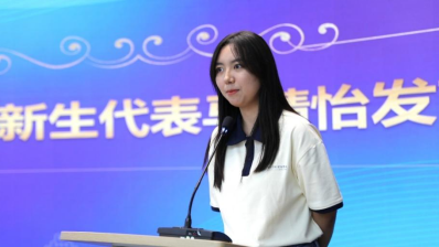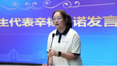 研究生新生代表、本科毕业于北京大学的硕S4227班的马婧怡同学用三个关键词向大家分享了自己对这段新旅程的理解。一是塑造,研究生阶段的学习是一个循序渐进的过程,更应从小事做起、于点滴努力,朝目标不断迈进;二是延伸,要善用与他人的连接,即“向外走”,新闻传播的课堂绝不局限于书本,要把论文写在祖国大地上;三是支撑,期待大家在学习和生活上相互鼓励,成长为一个独立、真诚、正直的人。