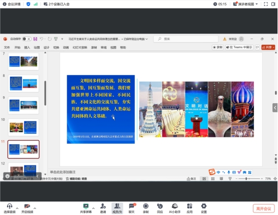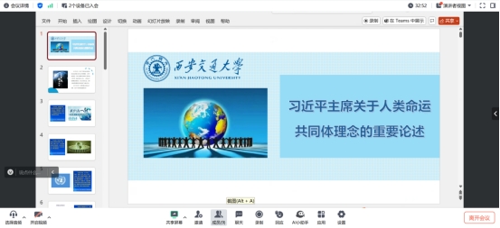 在随后的讨论环节中,参会教师分享了学习心得。刘婵君认为,人类命运共同体的全球化发展,还面临着霸权主义和强权政治、部分误解和偏见等困境,可以从关注全球性问题的研究、扩充人类命运共同体理念的具体内涵和形式等方面进行突破。刘彦认为,人类命运共同体是理解中国全球治理理念、方法和实践的重要基础。文化共鸣和情感互动能够更直观地推动国际社会对人类命运共同体的理解和认同。廖政贸深刻体会到,习近平主席提出的人类命运共同体理念不仅是对国际关系的深刻洞察,更是对学生世界观、价值观塑造的重要指引,应将这一理念融入课堂,引导学生思考气候变化、疫情防控、经济发展不平衡等全球性问题,从而更好理解全球性合作的重要性。王含阳认为,中西方国家存在历史渊源、哲学基础、价值观、宗教信仰等诸多文化理念差异,影响了双方思维方式和行为模式。因此,实现人类命运共同体理念的全球化推行,需要在尊重各国文化差异基础上,注重精准传播技巧的运用。达雅楠结合人类命运共同体的翻译情况,认为要在文明交流互鉴视域下进行话语转换和议题设置,从而切实推动国际传播效能。