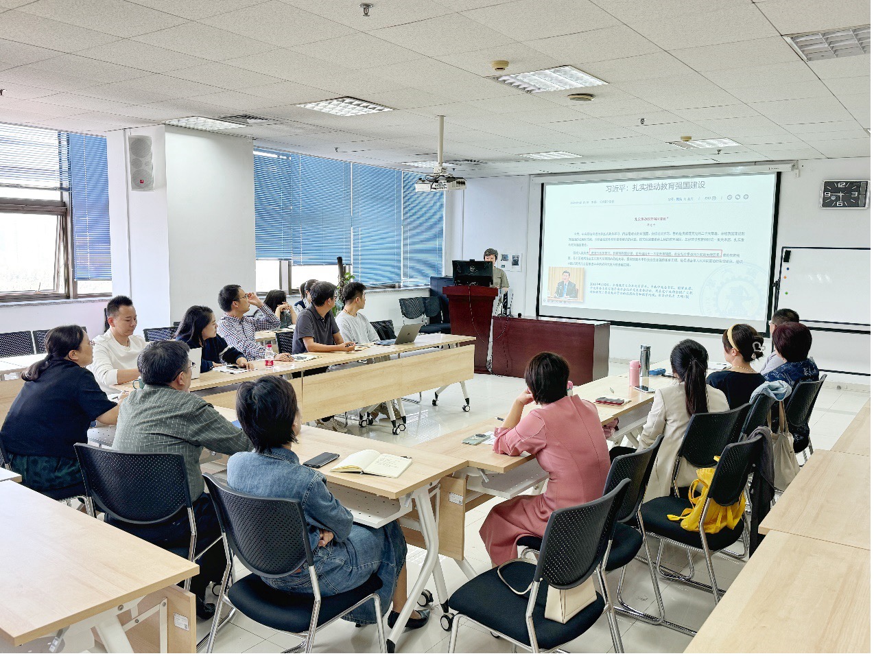 讨论环节中,与会师生代表结合所学内容积极开展研讨。杨琳教授以《山花烂漫时》张桂梅校长故事娓娓道来,提出“再苦都不能苦教育,教育的担子太重,需要大家共同承担”,坚持教育强国战略与中国式现代化的有机统一,要把教育放在首位!至于“培养什么人”,是品学兼优、积极乐观、全面发展的“全人”。黄蓉副教授提出教育者的责任不仅在于“教书”,更在于“育人”。有价值的教育是对学生批判性思维、创新能力和人文关怀的培养。教育者应当保持开放的心态,积极将先进的教学理念与方法融入教育实践,为学生提供更加优质、高效、个性化的教育服务。刘焕副教授关注教育公平、生成式人工智能战略对教育的影响。张立教授坚持教育要以人为本,不忘初心,牢记使命。张媛教授认为,新闻专业人才培养,需要关注学生差异性,明确学生未来发展方向确定人才培养计划。沈霄副教授指出,教育不仅是授业解惑的过程,更是塑造人生观、价值观的重要阶段。作为大学老师,我们肩负着为国家和社会培养合格建设者和可靠接班人的重任,这既是无上崇高的荣誉,也是使命在肩的责任。