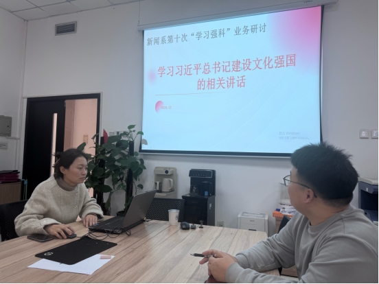 12月20日下午,新媒体学院新闻系在主楼E409新闻系办公室组织开展第十次“学习强科”业务研讨活动。本次活动的主题为“学习习近平总书记建设文化强国的相关讲话”,系主任徐婧副教授主持本次活动,助理教授刘丹领学,系所教师及博士生参与本次学习研讨。