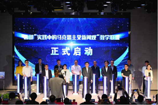 、四川大学、兰州大学、陕西师范大学、西北大学、宁夏大学、长安大学、新疆大学、西北政法大学、西安外国语大学、延安大学、西南民族大学、西北师范大学、青海师范大学、西藏民族大学等15所院校代表上台,共同启动西部“实践中的马克思主义新闻观”教学联盟。云南保山学院同为首批联盟院校线上观礼。