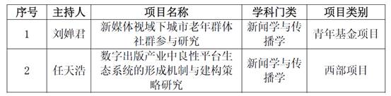 3月15日,2019年度教育部人文社会科学研究一般项目结果公布。 性爱影片 共有2个项目通过立项评审。此次获批项目分别为刘婵君老师主持的“新媒体视域下城市老年群体社群参与研究”、任天浩老师主持的“数字出版产业中良性平台生态系统的形成机制与建构策略研究”。此次2项课题获得立项,是近年来学院在科学研究坚持聚焦“新媒体与社会治理”等方向所取得成效的重要体现。