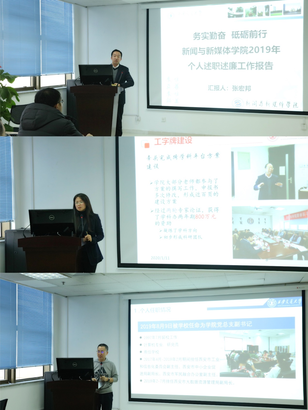 张宏邦副院长、孙鹤立副院长、韩博副书记依次就分管工作及个人廉政情况作了总结和展望。张院长全面梳理年度个人工作,围绕创新港建设、宣传工作、跑五工作、新新论坛等方面进行了总结。2019年度学院组织新新论坛13讲,跑五工作有序开展,组织召开了两次大型学术会议,如期入驻创新港。孙院长对分管的工字牌建设、科研、教学、国际交流与合作四大块工作从以德为先、工作完成情况、未来展望三个角度做了全面梳理。2019年度学院获批“智媒体与社会治理”跨学科平台建设,基本完成一期建设任务,预计2020年4月,实现全面建成。人才培养、科学研究、国际交流稳步提升,SCI论文发表实现突破,学院获授课竞赛全校优秀组织奖荣誉表彰。韩博副书记围绕基层党建及学生工作进行了汇报,提出2020年工作重心将从继续加大基层党建工作,抓好思想政治工作、学生工作、“跑五”工作、信息化工作、督办工作六方面展开。