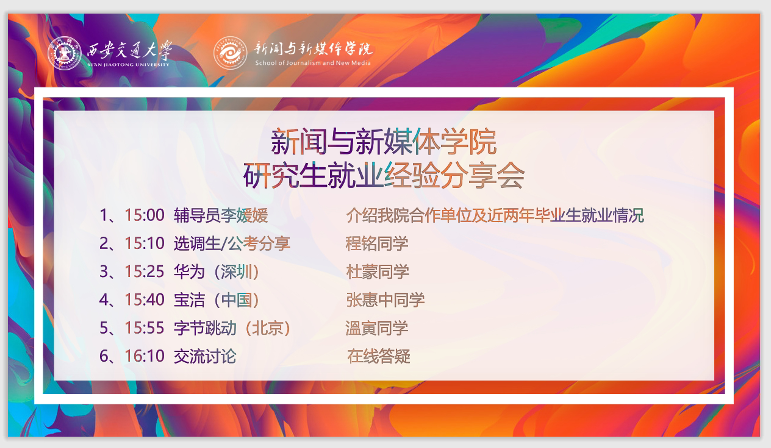 本次经验交流会经过前期的精心筹划和准备,学长学姐们毫无保留地传授经验,最终圆满举行,通过这场分享会,一方面鼓励同学们在疫情期间要学习更多的技能,抓住沉淀自我、提升自己的好机会,另一方面也为同学实习、就业准备提供了更为明确的指引,对求职目标有更为清晰的认识。