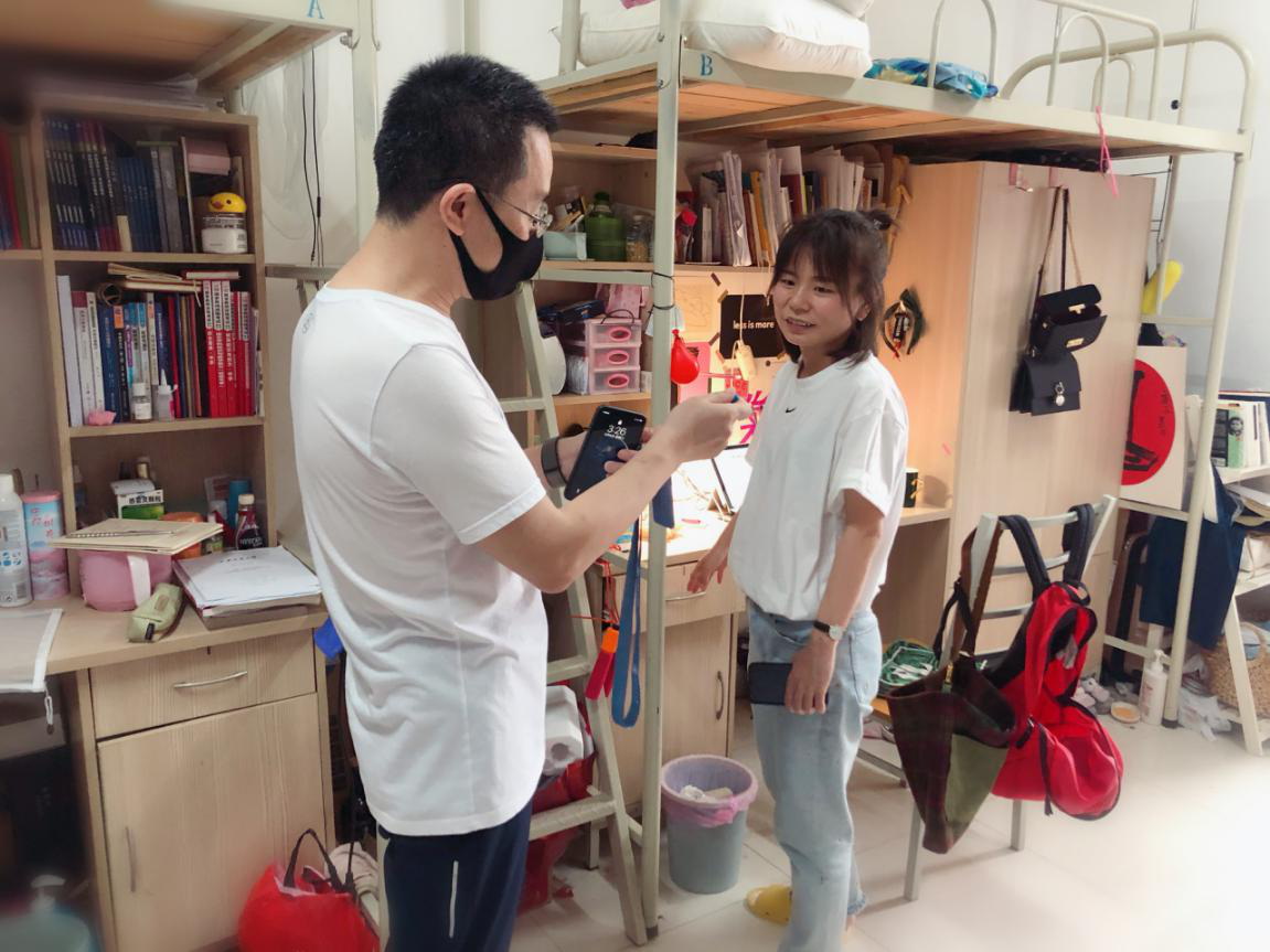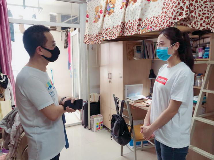 副书记韩博、辅导员李媛媛深入学生宿舍,关心慰问返校学生并发放健康包。