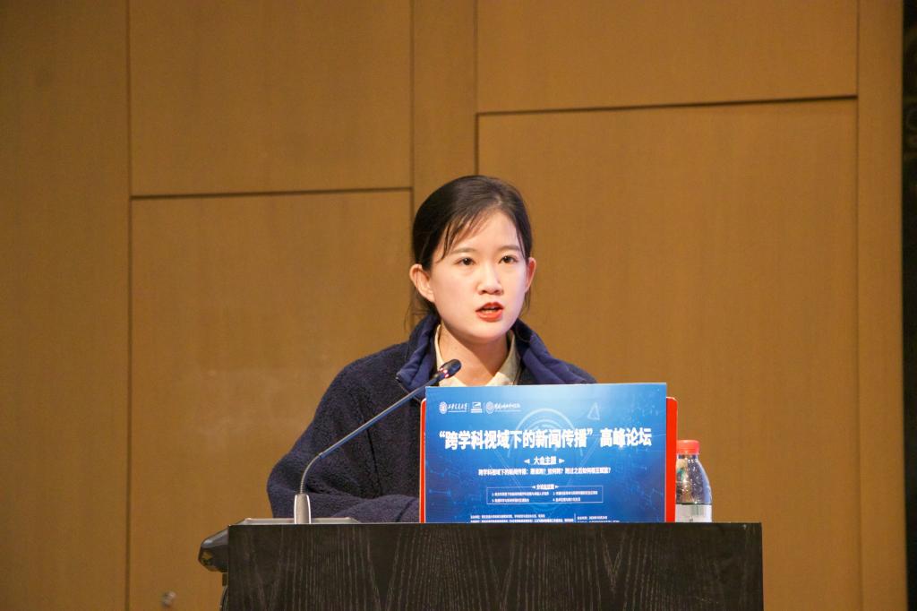 新媒体学院硕士研究生马欣然做了题为《守正创新:新文科背景下“网络与新媒体”专业人才培养路向》的发言。她认为目前的人才培养体系存在教育评估以科研为导向、课程设置止步于“姿态性”融合、专业自信与自觉缺位、培养目标“脸谱化”程度高等痛点问题,对此,学界和业界也从双师制、部校共建、校企合作、学科交叉、三三制改革等方面做出了探索。