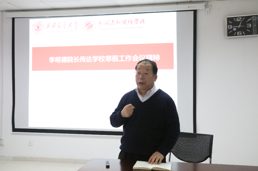 1月24日下午,新媒体学院召开2020年终全院教职工大会,传达学校寒假工作会议精神。学院党政领导班子成员及40余名教职工参加了大会,学校考核工作组代表、组织部马瑾老师列席指导,合作企业西安博达软件股份有限公司董事长魏小立、西安鹏胜教育科技有限公司董事长苏鹏、美林数据股份有限公司董事长程宏亮出席本次会议,党总支副书记韩博主持。
