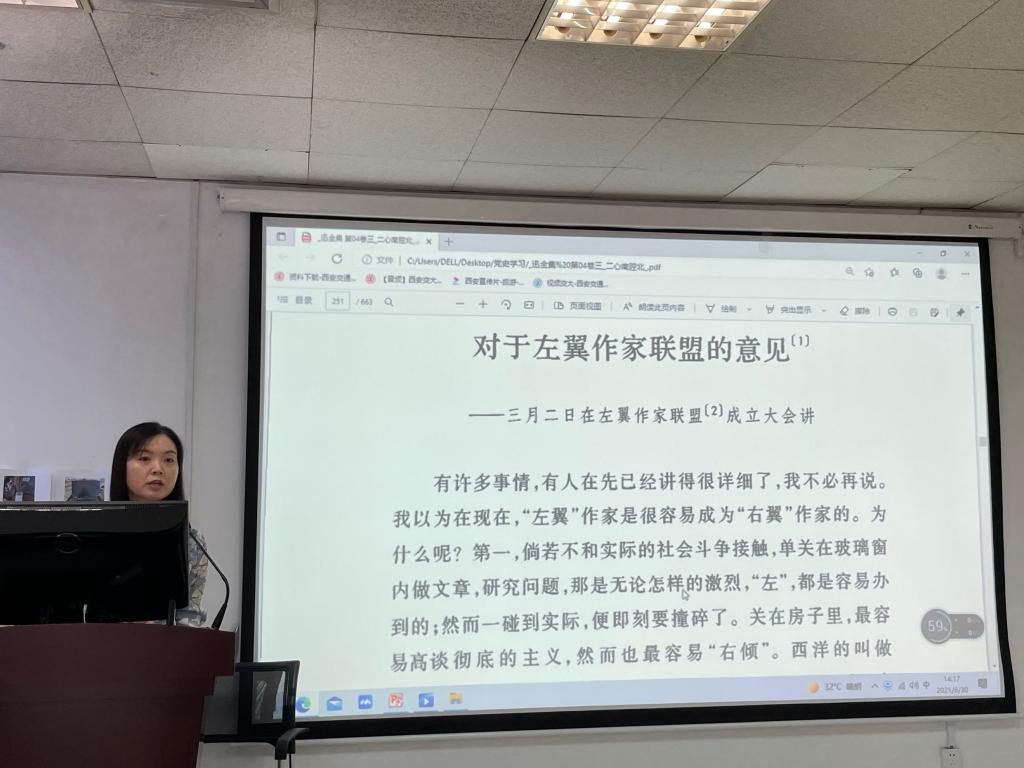 宋欢迎副教授在文化传播领域深耕多年,她结合自身理论研究与搜集到的珍贵资料,为传播系党支部成员分享了鲁迅先生的革命事迹及其与中国共产党人的结缘故事。分享伊始,宋老师就用她在纪念馆中收集到的一幅幅照片,将鲁迅先生的革命事迹娓娓道来:从应邀出席以反对国民政府独裁统治为宗旨的“中国自由运动大同盟”成立大会而遭到国民党浙江省党部的通缉,到参加中国共产党外围组织中国革命互济会并多次捐款,再到与毛泽东、朱德等中国共产党革命领导人共同当选世界反对帝国主义战争远东会议主席团名誉主席,鲁迅一直用实际行动,支持着中国革命事业的向前发展。