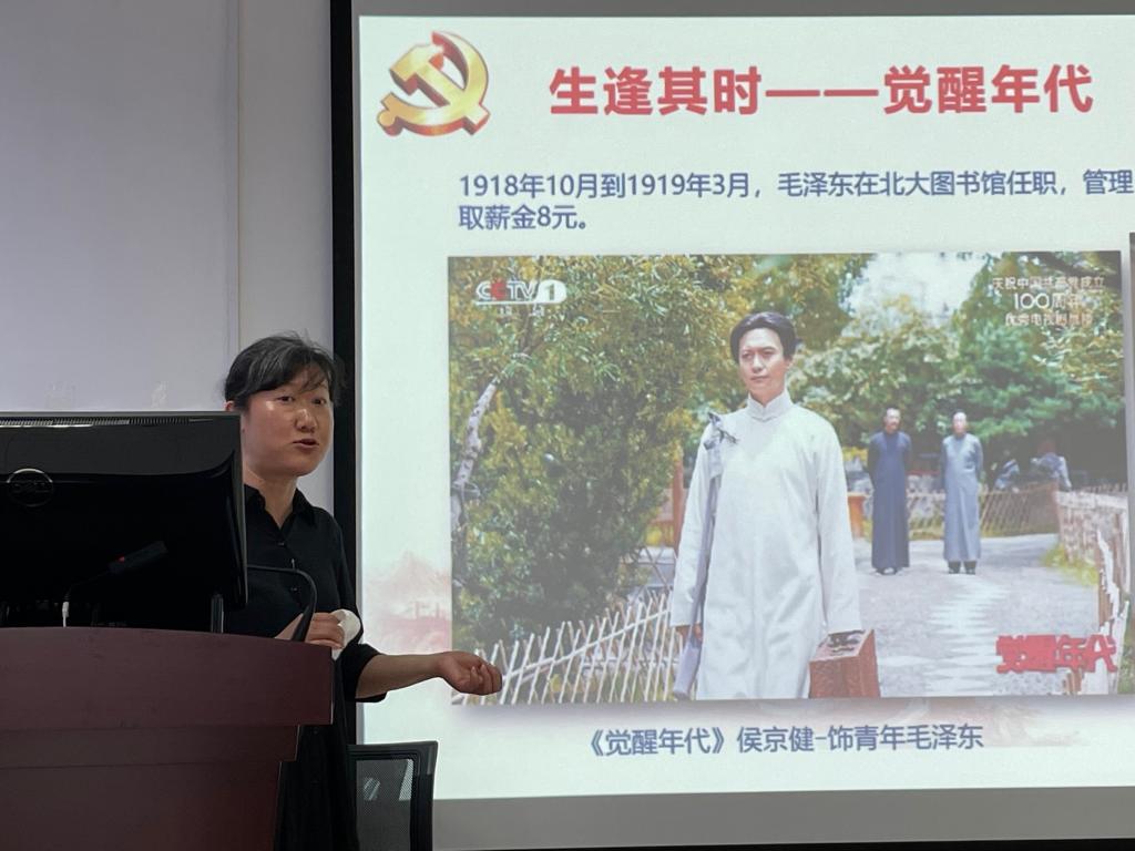作为马克思主义新闻观研究者之一,叶妮副教授结合自身研究与教学经验,为传播系党支部成员呈现了一场内容丰富、形式多样的微党课,讲述了毛泽东同志在青年时期的新闻实践与先进宣传理念。她从近期热播的革命历史电视剧《觉醒年代》引入,分享了毛泽东与北大的不解之缘,认为正是由于受到过中国第一个新闻学术团体“北京大学新闻学研究会”的系统培训,才奠定了毛泽东在后来新闻宣传上的先进理念与丰富实践。从1919年主编《湘江评论》时发出“浩浩荡荡的新思潮业已奔腾澎湃在湘江两岸了”的时代呐喊,到1922年担任《大公报》特约记者时连续发表系列专栏文章《湖南建设问题》,都无一例外地彰显出青年毛泽东在新闻工作上的深刻洞察。