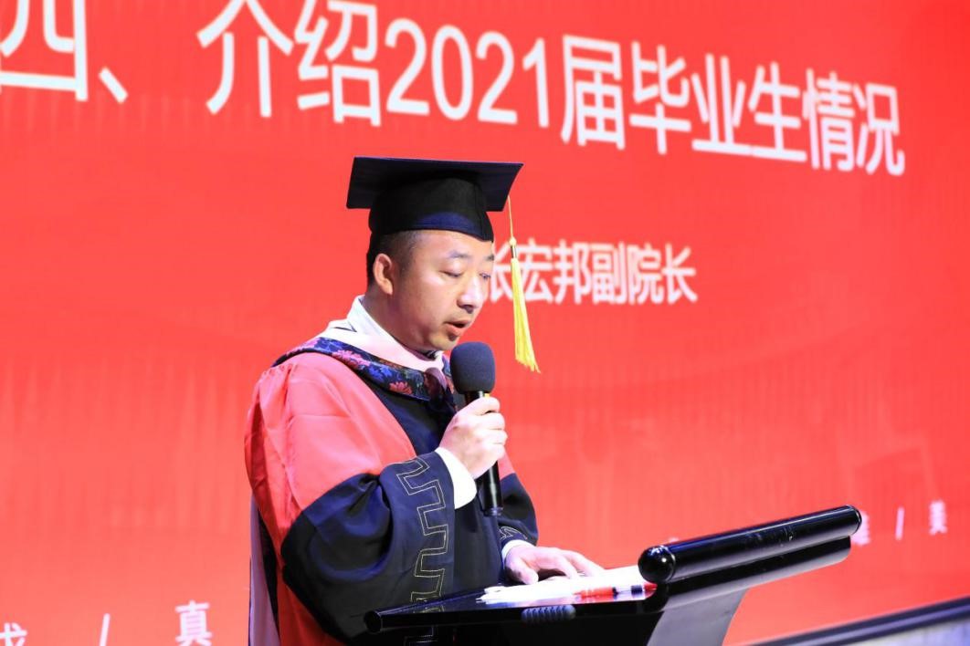 骊歌唱响,共期未来。7月3日,新媒体学院隆重举办2021届学生毕业典礼暨学位授予仪式,院党总支书记兼院长李明德,党总支副书记韩博,副院长张宏邦、马忠,崇实书院院务副主任段继超,硕士生导师,本科生班主任,校友代表,家长代表等参加,党总支副书记韩博主持典礼。