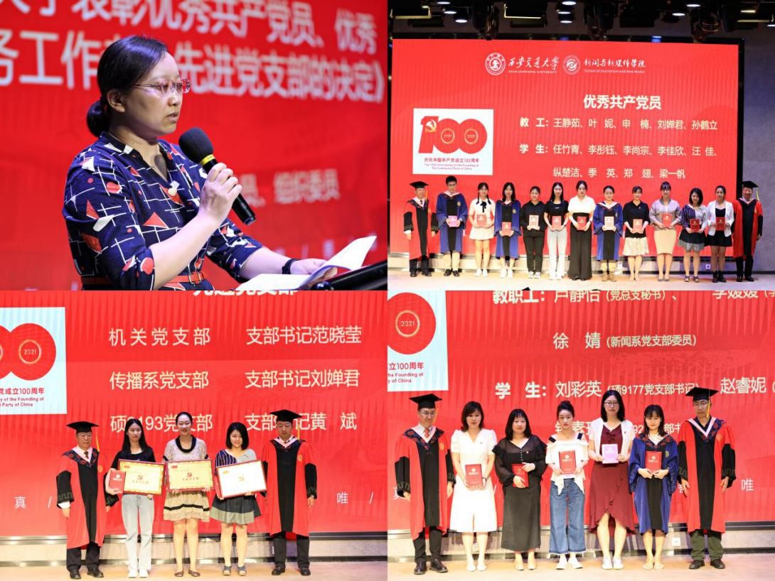 党总支委员张立副教授宣读新媒体学院《关于表彰优秀共产党员、优秀党务工作者、先进党支部的决定》,经党支部推选,学院党总支委员会会议审议,表彰王静茹等14名优秀共产党员、卢静怡等6名优秀党务工作者、机关党支部等3个先进党支部。李明德院长、韩博副书记、张宏邦、马忠副院长为获奖同志颁奖。