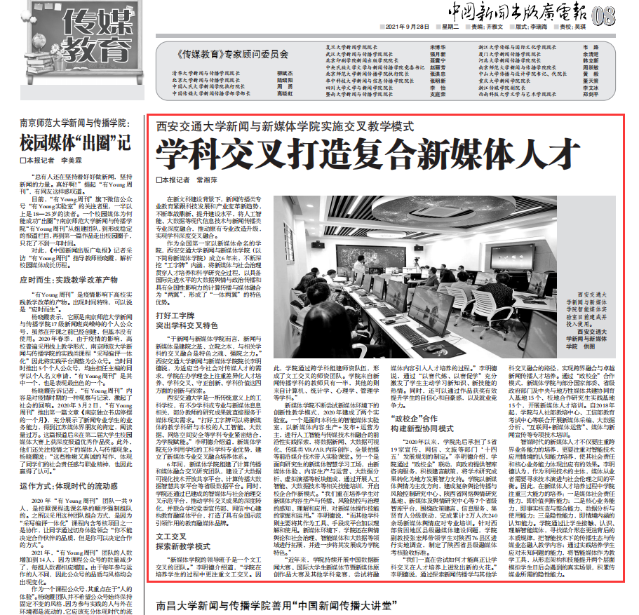 是一所传统意义上的工科学校,有不少学科或专业与新媒体息息相关,部分教师的研究成果就直接服务于媒体现实需求。“打好工字牌可以将新媒体的教学科研与本校的人工智能、大数据、网络空间安全等学科专业紧密结合,为学院赋能。”李明德介绍道,新媒体学院充分利用学校的工科学科专业优势,建立了新媒体专业交叉融合培养体系。