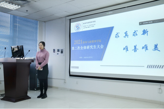 主持人向全体学生做了第二届研究生会工作报告。从党建宣传活动、特色品牌活动、各部门主要活动以及常规工作四个部分对学院研究生会的日常工作进行了详细报告。此外,主持人还介绍了“定格光影”、“微光”公益线上支教等富有学院特色和社会意义的各类活动。主持人也强调新闻与新媒体研究生会紧紧围绕院党委、团委的中心工作,矢志不渝地践行全心全意为广大研究生服务的宗旨,积极听取和响应同学们的普遍诉求,创办了许多令广大师生喜闻乐见的内容。
