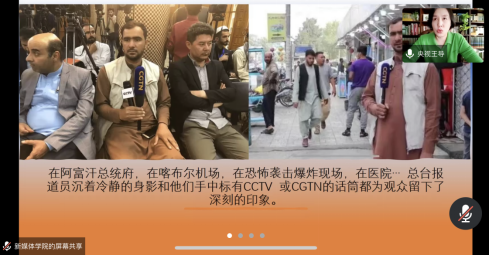 来自中央广播电视总台的王雪莲提供了业界研究新鲜视角,以《打造国际传播品牌提升传播能力》为题进行分享。她谈到,应对2021年8月、9月接连发生的阿富汗、几内亚局势变化,大约在三周时间内,总台连续播发了12次塔利班官员专访和13次前阿富汗政府官员专访,人物专访、动态消息、现场报道、新闻连线以及评论综述各种节目,在全球95个国家和地区1599个电视台播出。截止到9月5日,总台播发的有关阿富汗新闻,跨媒体总触达人次达到了73.33亿。在以往的国际新闻报道序列中,中国媒体总扮演着“二传手”的角色, 而在此次连续发生的重大国际事件面前,中国媒体成为全球信息源,也印证了中国媒体的国际传播能力的稳步提升。