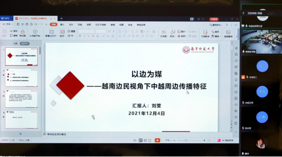 南宁师范大学的刘雯老师对周边传播理论研究进行了阐述,分享了题为“以边为媒——越南边民视角下中越周边传播特征”的研究。她以周边传播作为理论视阈,通过问卷调查和田野访谈的方式,调研越南边民对种态度、与中关系,从政治交流、经济交流、文化交流、信息交流、情感交流五个方面解读中越边境地区边民交流现状与传播特征。最后,刘雯对推进中越边境周边传播提出政策建议:建立安全稳定的周边传播环境;构建“点线圈”式周边经济共同体;搭建多远立体的边疆教育文化载体;增强边疆媒体的主体性作用;因地制宜提升边境治理效能。