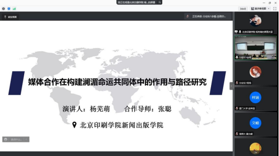 北京印刷学院新闻出版学院张聪老师及研究生杨芜萌做了题为“媒体合作在构建澜湄命运共同体中的作用与路径研究”的报告。她指出“澜湄合作”是共商共建“一带一路”的重要平台,但现阶段媒体合作情况面临缺乏清晰规划和资金存在不足等方面的问题,提出了拓展澜湄合作主体视角研究维度、发挥媒体在构建澜湄命运共同体中的独特作用、构建中国主导的中外媒体合作路径、提供新型的中外媒体合作方式四种路径。