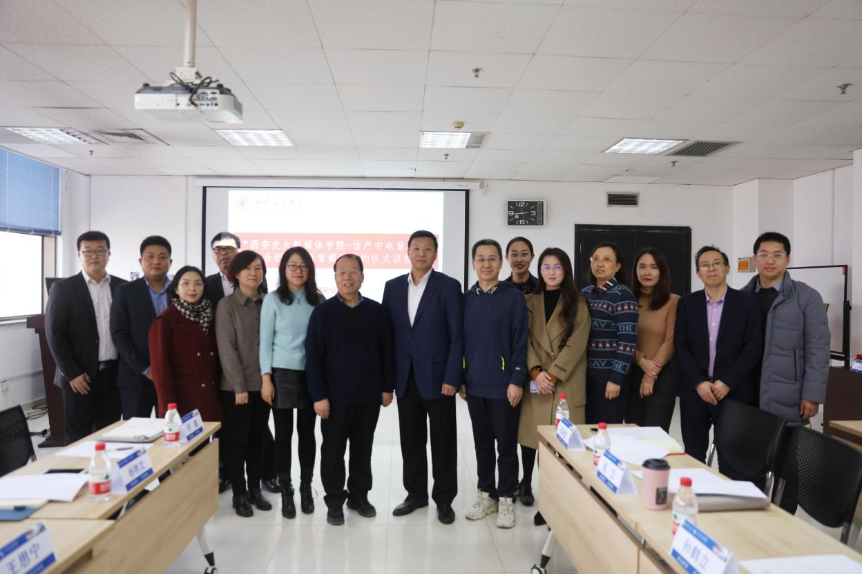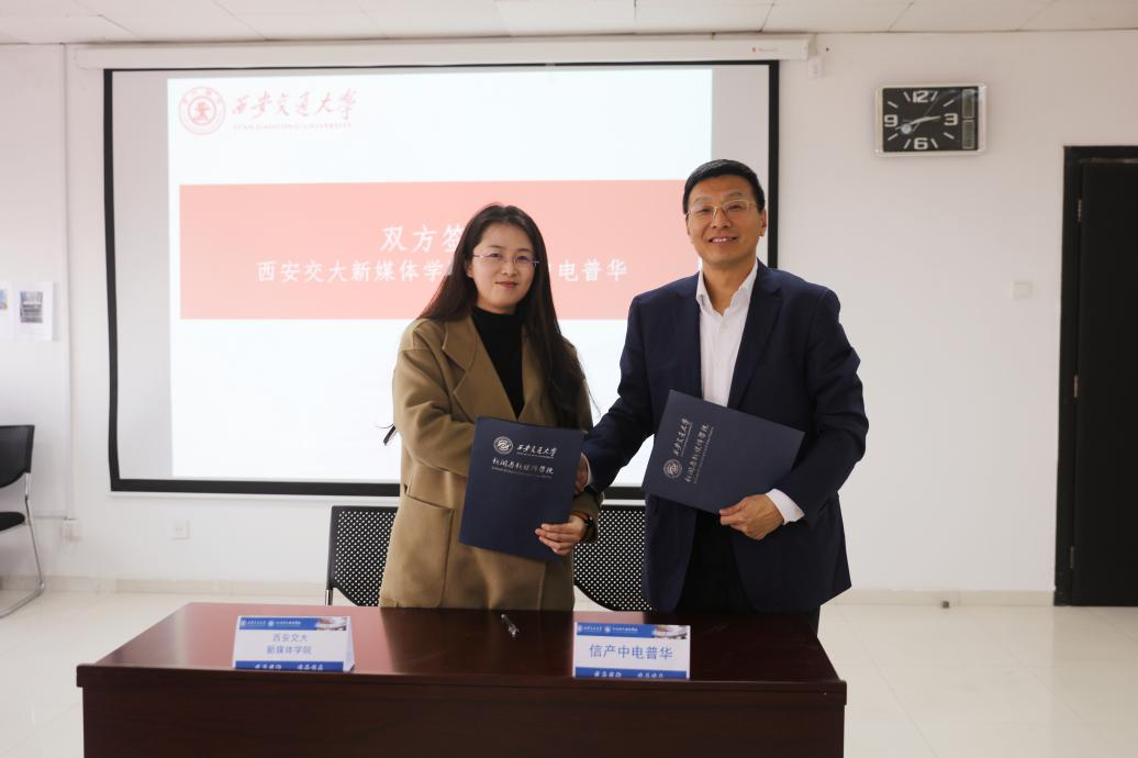 12月9日,新媒体学院与北京中电普华信息技术有限公司(以下简称“中电普华”)在主楼E1104举行“西安交大新媒体学院-信产中电普华”联合创新实验室揭牌签约仪式,新媒体学院党总支书记兼院长李明德、副院长孙鹤立、院长助理张立及办公室、系所负责人,中电普华董事长、党委书记赵建保,副总工程师、能源物联及区块链事业部总经理(兼)王思宁一行8人参加,学院副书记韩博主持仪式。