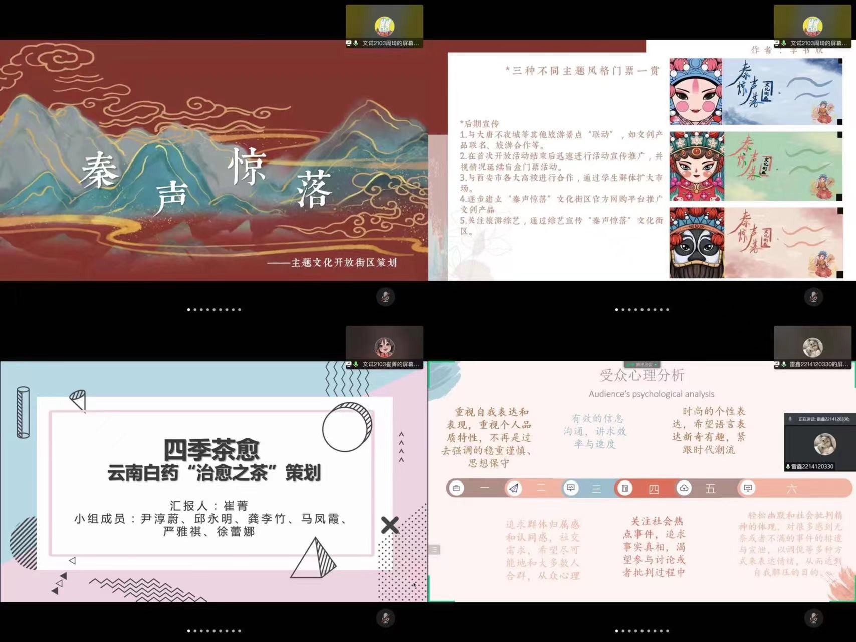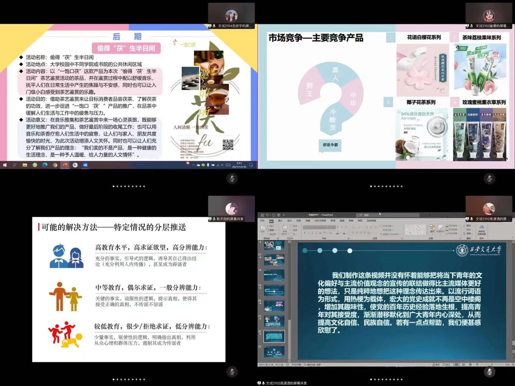 40余组的汇报展示展现出学生认真、精细的求学态度,整体呈现出了较高的选题、执行、展示能力,其中不乏精彩亮点。比如:有小组尝试探讨党史宣传、百年中共宣传能否尝试与流行词、网络热梗相结合,增强党史宣传的趣味性,提升党史宣传在青年一代的传播力;有小组探究新媒体时代时政类谣言的产生与治理,深探辟谣难题与舆情应对;更有小组从日常生活出发,关注交大校园,从传播学的角度试图解决七彩阁生活问题,为宿舍建设出谋划策;策划交大姻缘社,依不同书院学生专业构成设计不同风格的海报,创意满满......从线下转移到到线上,汇报平台的改变丝毫不影响同学们稳定高质量的发挥,最终为这门课交上满意的答卷。