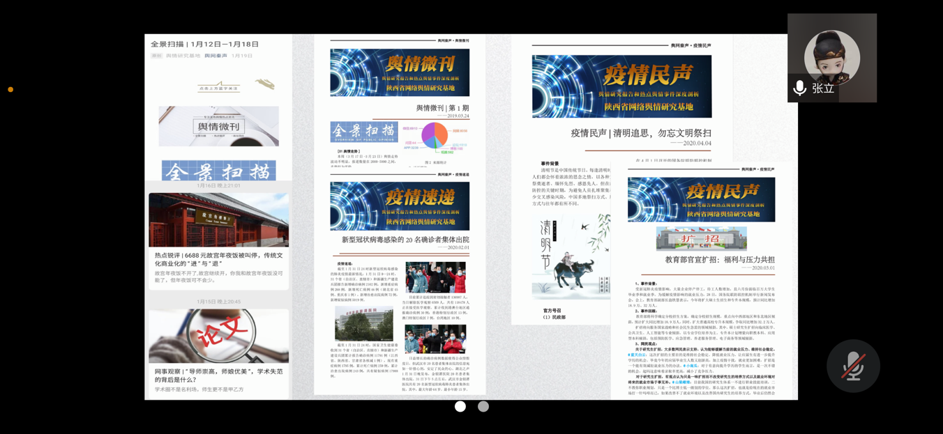 党总支委员、院长助理张立结合调研成果,从建设概况、工作体系、平台建设、项目成果和未来规划等五方面展开,对新媒体学院自2015年以来的智库建设工作作了梳理与总结。她表示,舆情研究成果现已有效服务于学院教学和科研,在专著出版、国社科基金项目和教育部课题争取、高质量论文发表(《新华文摘》全文转载)、省级一流课程获批、人才培训和社会服务等方面大有助益。围绕新媒体与社会治理、体现“工字牌”内涵建设、实现了传统媒体与新媒体的融合并实现线上线下互动的立体式运行发展、成为中省党政部门重要的决策支持,是她对智库特色功能的总结。