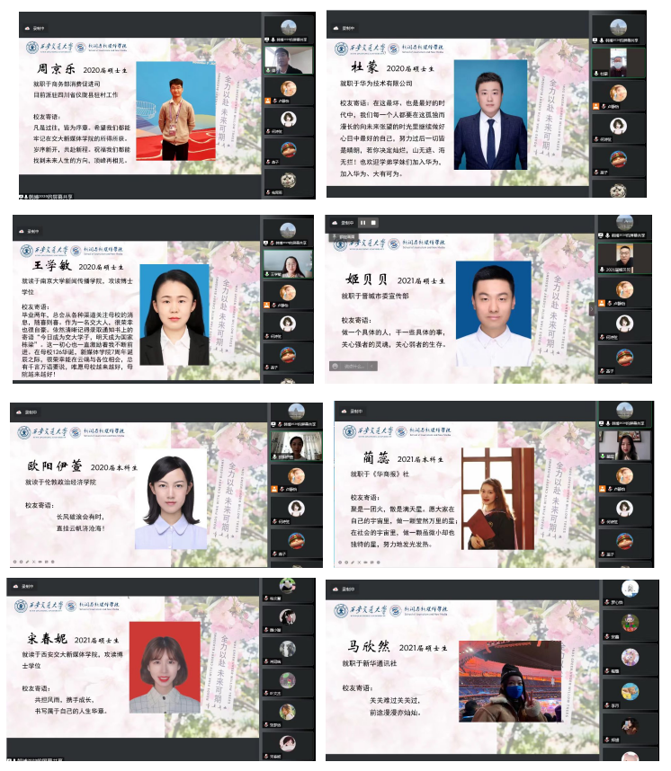 此次座谈会以线上形式举行,邀请到了知名校友、西安博达软件股份有限公司董事长魏小立先生,知名校友、美林数据技术股份有限公司董事长程宏亮先生,以及优秀毕业生周京乐、杜蒙、王学敏、姬贝贝、宋春妮、马欣然、欧阳伊萱、蔺蕊等8名校友。新媒体学院党总支副书记韩博主持,副院长孙鹤立教授出席,学院70余名师生参加会议。