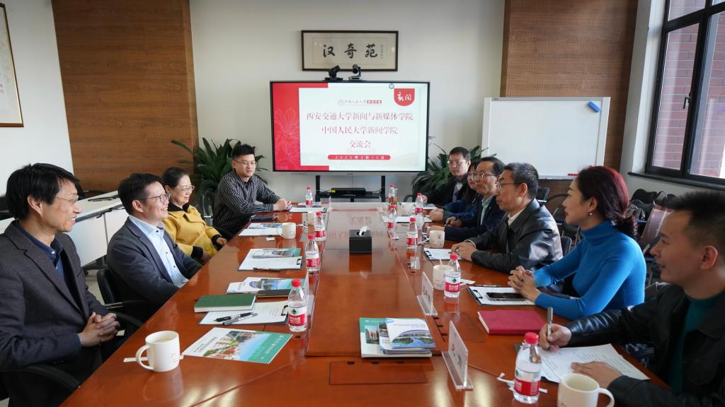 周勇表示,新闻传播学科兄弟院校守望相助,中国人民大学新闻学院的发展得益于大家的支持,人大新闻学院将强化与兄弟院校沟通交流,携手发展;张辉锋对西安交大新媒体学院的来访表示欢迎,介绍了中国人民大学新闻学院的专业设置和学科架构,以及本硕博一体化人才培养体系;王润泽表示,借力与其他强势学科交流、助力,“站位高、有定力”“与国家需要紧密结合”“史论基础雄厚”是人大新闻学院能够持续发展的重要保障。