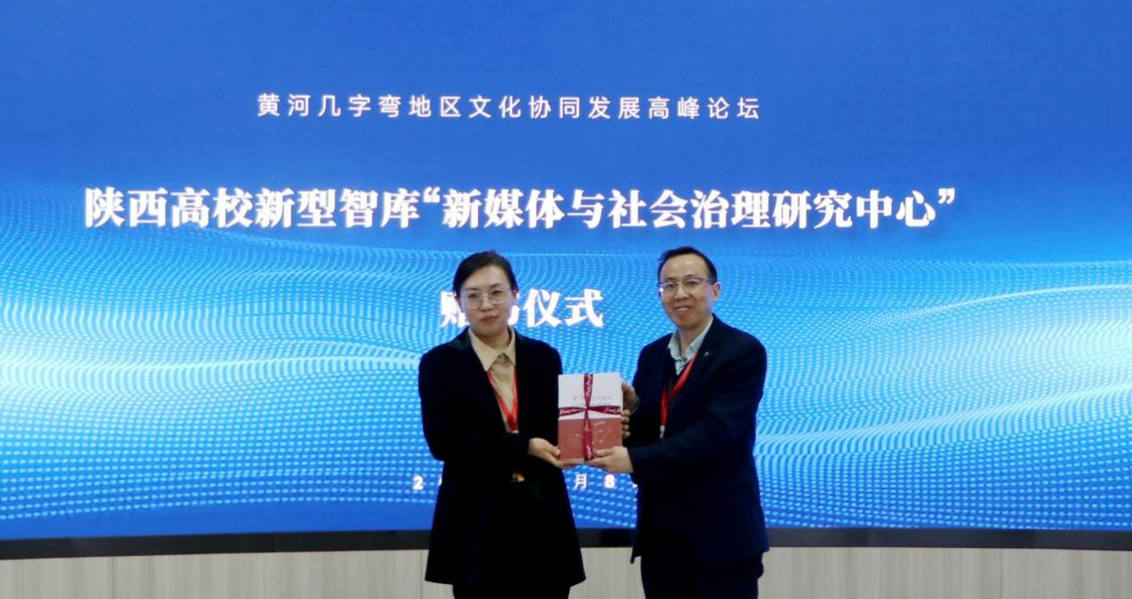 智库走出陕西的一次成功尝试。河套学院科技处处长于新海和马忠院长为分中心揭牌。智库主任吴锋教授代表智库向陕西省高校新型智库“新媒体与社会治理”研究中心河套学院分中心赠书。