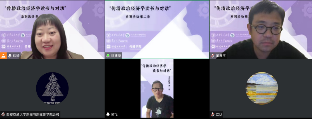 的徐婧副教授担任主持。浙江大学传媒与国际文化学院吴飞教授与中国人民大学新闻学院董晨宇老师作为对话嘉宾,深入解读了的经典著作《数字化崇拜:迷思、权力与赛博空间》。同时,两位嘉宾围绕文本,通过对话的形式分享了他们对传播政治经济学及文化研究的相关思考。