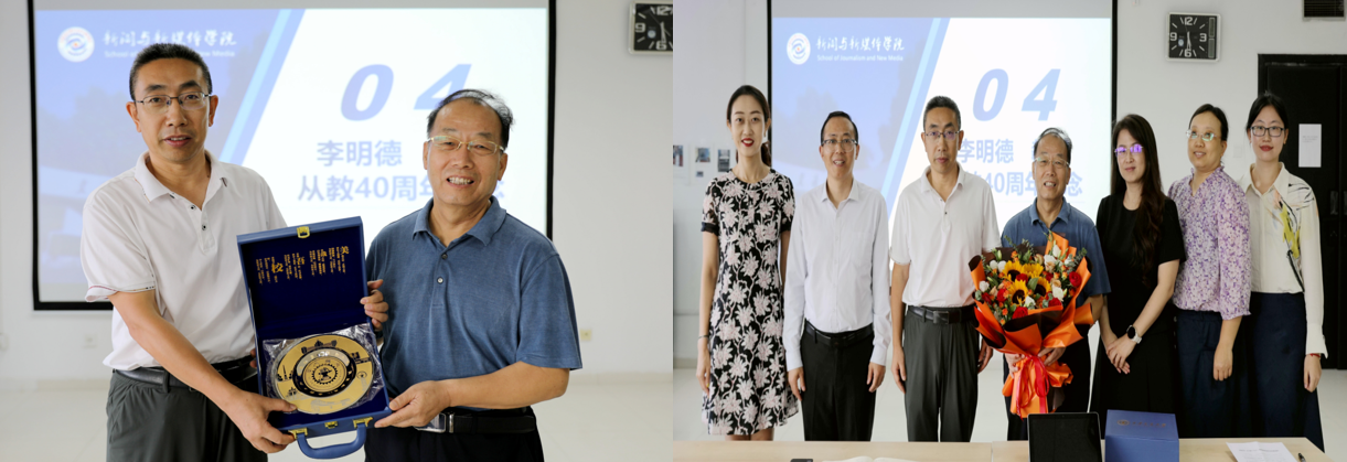 会议举行了李明德教授从教40周年纪念仪式。马忠代表全院教工为李明德教授赠送纪念品,衷心感谢李明德教授的辛苦付出和引领学院学科发展所作出的重要贡献,表示要学习李明德教授的高尚品德和对学术孜孜不倦的追求精神。教师代表送上鲜花祝福并合影留念。
