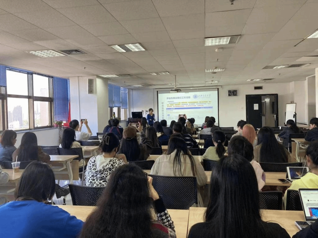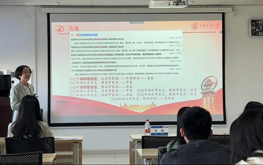 随后,赵星宇详细解读选调生政策,结合学院往年实际录用情况,为毕业生们梳理不同省份及不同类型选调生的报考流程。她表示,近年来,学校高度重视选调生工作,为学生提供“宣讲”“送考”“轮训”等各项保障服务,有力地增强了毕业生报考选调生的竞争优势,也呼吁广大毕业生应当立大志、明大德、成大才、担大任,传承西迁精神,到祖国需要的地方建功立业。