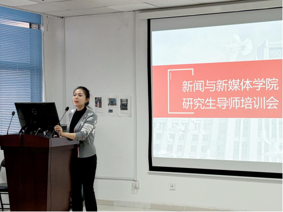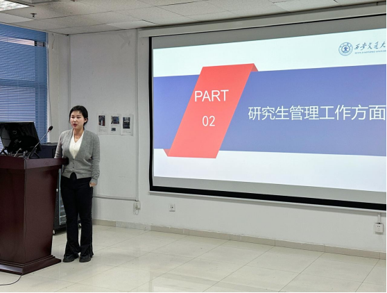 随后,教务秘书王静茹就学校及学院与导师相关的具体要求及相关政策进行解读,明确了导师在研究生培养过程中的职责,加深导师对相关政策制度的了解,提升研究生导师的指导能力。希望导师在研究生培养过程中坚持学位授予的底线思维,细化流程、压实责任,进一步提高研究生培养质量。作为秘书将为老师们做好服务,为师生教学保驾护航。