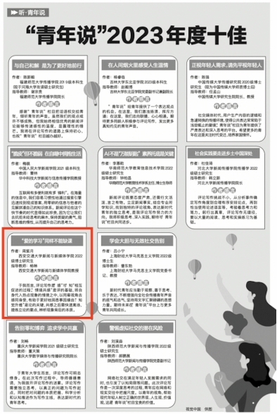 “青年说”栏目2023年度十佳作品获得者周紫月分享道:时评写作的首要在于多积累社会实践,学会在共感他人中发掘事因缘由。同时要打开视野的“格局”,以第三人的客观视角俯察事件全貌,才能精准立论,发现本质。