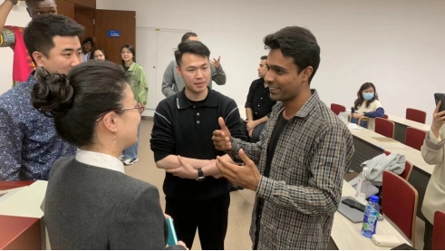 活动最后,外国语学院副教授吉乐老师对本次活动进行了点评与高度肯定:她不仅对译员的现场表现表达了认可;同时还鼓励国际教育学院的留学生用汉语在中国短视频平台账号上讲述自己的留学故事,让更多外国人了解中国,人做中外文化沟通的桥梁和纽带;最后,她也期待新媒体学院与外国语学院未来能够继续共建此类活动共同学习。