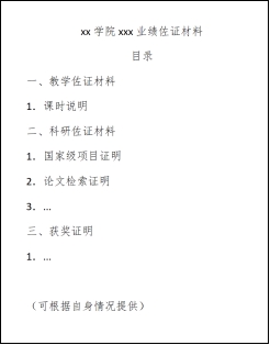 1.系统中未抓取的教学、科研、获奖等业绩,需提供佐证材料的,请按下图格式梳理为单个PDF文件,在系统“其他佐证材料”处上传。