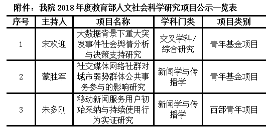 此次3项课题获得立项,是近年来学院在科学研究和人才培养方面坚持聚焦“新媒体和大数据舆情”所取得成效的重要体现,也是学院在学科建设、服务社会和人才培养方面强化质量建设的重要阶段性成果。