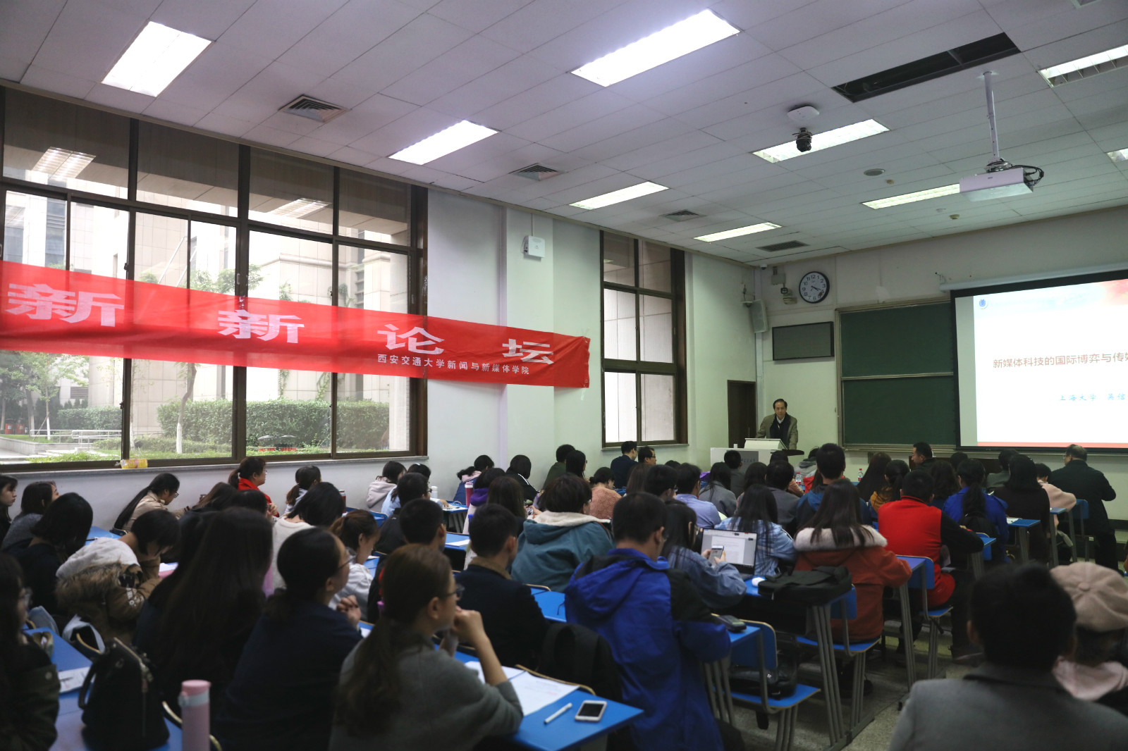 “新新论坛”,吴教授的讲座以“新媒体科技的国际搏弈与传媒人才培养创新”为主题,主要从新媒体科技背景下的国际博弈和传媒人的社会担当与人才培养两个角度出发,为交大师生带来了一场精彩纷呈的前沿报告。讲座由新媒体学院院长李明德教授主持。