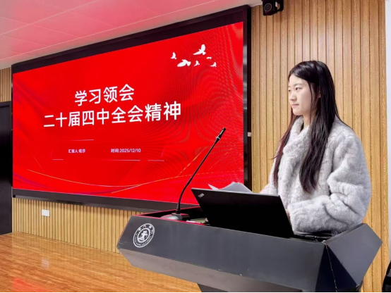 会上,博士生荀莎同志作了题为《学习领会党的二十届四中全会精神》的专题领学报告。报告系统梳理了全会召开的背景与意义,详细解读了全会审议通过的《建议》的起草过程、框架内容及其重大意义。重点围绕全会明确的“十五五”时期发展的总方针、必须遵循的六大原则以及涵盖经济、科技、改革、文化、民生、生态、安全等关键领域的七大目标进行了深入阐述。报告结合“任务聚焦重点”部分,分析了以科技创新催生新质生产力、建设现代化产业体系、构建新发展格局、深化改革开放等战略部署的内在逻辑与实践要求。同时,报告强调了全会对扎实推进共同富裕、推动绿色转型、筑牢国家安全屏障等民生福祉与安全保障工作的部署,以及以党的自我革命引领社会革命、汇聚团结奋斗力量、狠抓落实确保开好局起好步等方面的明确要求。领学内容全面系统、重点突出,为支部成员深刻理解全会精神提供了有力辅导。