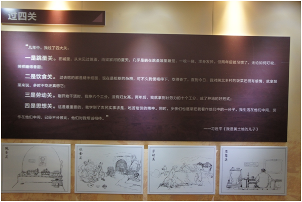 村史馆为参观者对梁家河的历史与现状提供了有效了解渠道,展示了北京知青插队下乡、锻炼生活的情况,记录了梁家河村的逐梦之路。配以插图的习近平总书记提出的“过四关”展板前围满了人,大家被有趣的文字逗乐,也被吃苦精神感染。