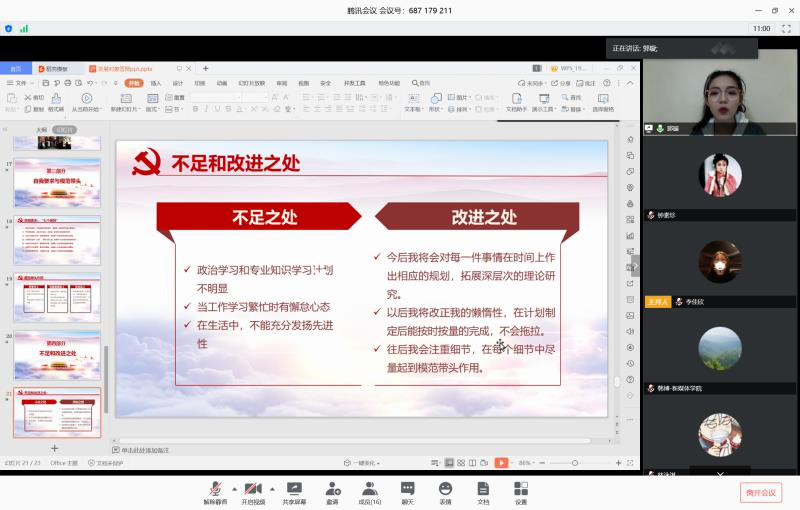 4月23日晚7点30分,新媒体学院利用钉钉平台开展了“跟着总书记学历史,继续发扬西迁精神”党支部学习会暨入党积极分子展示活动,党总支副书记韩博,辅导员李媛媛,硕7094、8086党支部和硕9177、9178党支部成员参与,会议由硕9177、9178党支部组织委员李佳欣主持。
