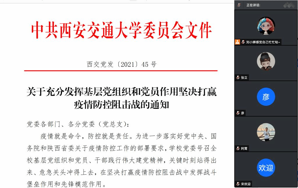 其他支部成员都对自身防疫和身边抗疫情况做了简要介绍,大家都一致表示,保持平稳心态,互帮互助,一起共度难关。作为党员教师,我们要有一份热发一份光,同心抗疫,共克时艰。虽然当前西安的疫情形势依然比较严峻,但相信在党和国家的坚强领导下,我们一定会拨云见日,迎来疫情防控阻击战的胜利!