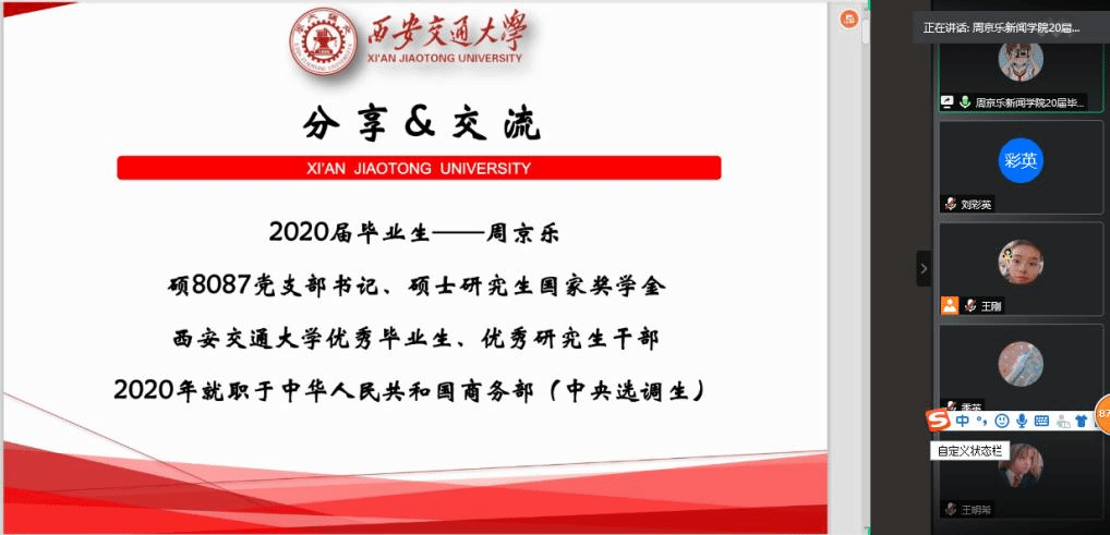 硕9178党支部举办以“发挥党员传帮带作用,助力毕业班同学就业”为主题的组织生活会暨就业分享会。以党支部为桥梁为全体支部成员提供交流平台,贴近学生实际关切,鼓励毕业生将小我融入大我,实现个人职业发展与社会发展的紧密连接。本次线上分享会由硕9178党支部书记姬贝贝主持,原新媒体学院硕8087党支部书记周京乐(现就职于中华人民共和国商务部)受邀作求职就业分享,党支部全体成员及积极分子共同参与。