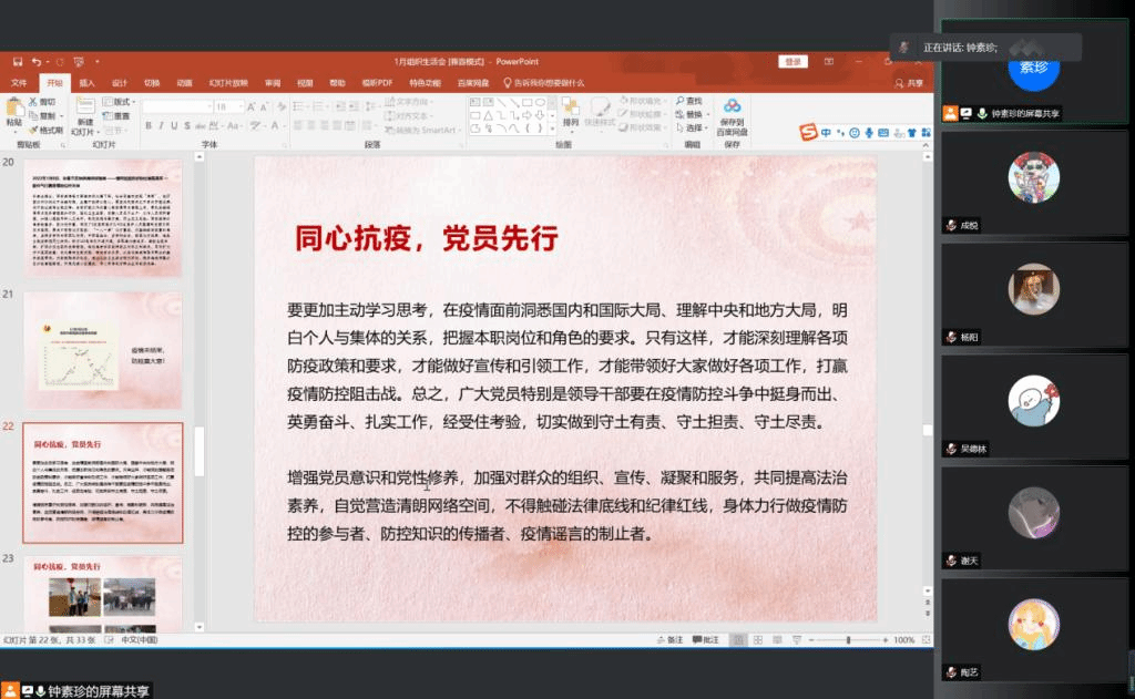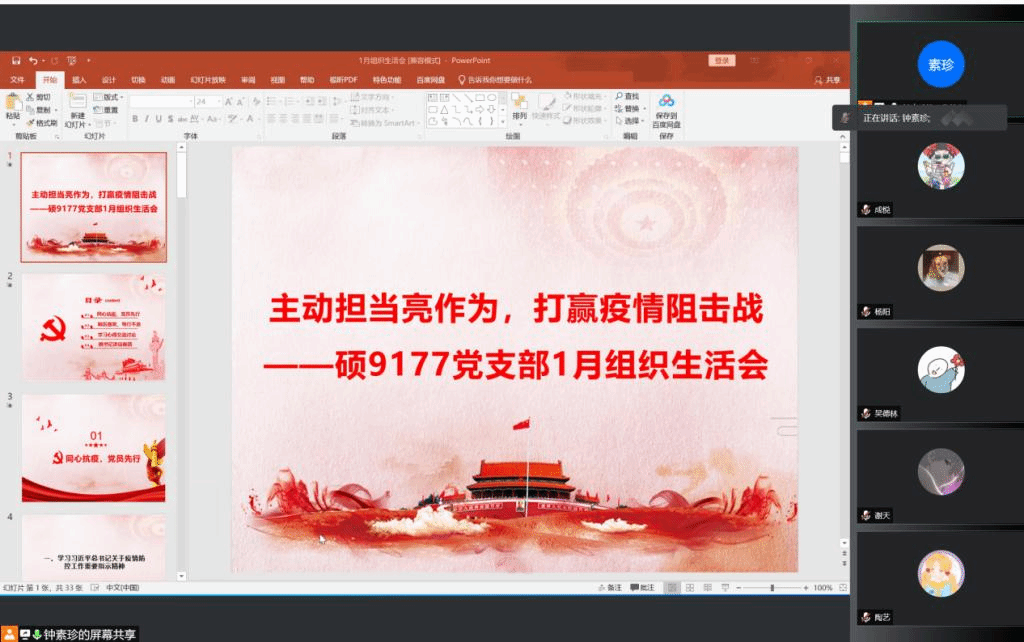 硕9177党支部在线上召开了“主动担当亮作为,打赢疫情阻击战”专题组织生活会。新媒体学院党总支副书记韩博、硕9177党支部全体党员、预备党员及所联系的群众参与了此次会议。会议由硕9177党支部书记钟素珍主持。
