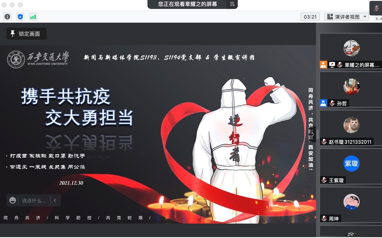 听完志愿者的分享后,硕1193党支部书记孙哲同志鼓励大家在后续的抗疫先锋队工作中,能够积极加入组织,以自身行动与毅力协助医护工作人员共同抗击疫情,为疫情防控贡献自己的一份力量,展现新闻与新媒体学子的凝聚力以及攻克疫情的决心与毅力。硕1194党支部书记章耀之同志也动员大家能够积极将学科优势和疫情防控结合起来,可以参与剪辑抗疫宣传视频、创作抗疫宣传新闻稿件等工作。在组织生活会最后,参与会议的硕1193、1194党支部成员共同在屏幕上表明了对于抗击疫情的决心:“战疫长安,凝聚新新力量”。
