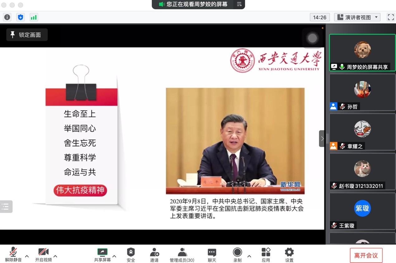 学生微宣讲团成员周梦姣同学进行了“携手共抗疫,交大勇担当”主题宣讲,此外,支部成员进行了抗疫期间志愿工作的积极分享。