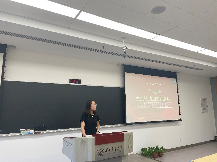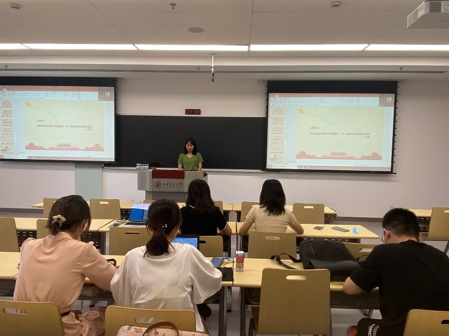 随后,硕9177班党员张雪以“百年党史看中国共产党的凝聚力:从一盘散沙到中华民族共同体”为主题,主持本期党史学习教育。她从救国大业、兴国大业、富国大业、强国大业四个维度讲述了中国共产党的百年辉煌历史,呼吁全体同志在学习百年党史的过程中汲取思想的力量、信仰的力量、道德的力量、实践的力量,为实现第二个百年奋斗目标,实现中华民族伟大复兴而不懈奋斗。在钟素珍的组织下,硕9177党支部围绕该议题展开热烈讨论。成悦对比国内和平与国外战乱,强调是中国共产党带领我们彻底结束了旧中国一盘散沙的局面,为人民带来幸福美好的生活。陶艺结合暑期调研经历,提出可以通过建强用好民族地区县级融媒体中心来铸牢中华民族共同体意识。吴德林回顾了暑期党课学习经历,号召大家传承发扬革命先辈无私奉献、艰苦奋斗的精神,不忘初心,砥砺前行。