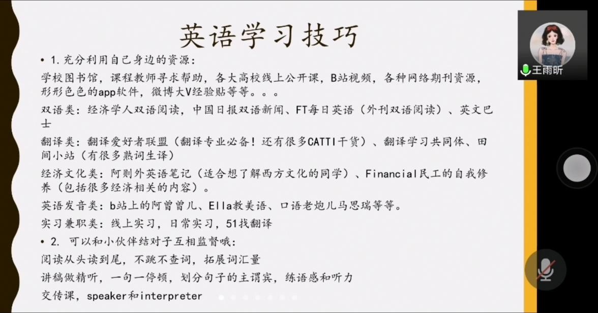 硕0193党支书黄斌及上海外国语大学英语学院第十五党支部书记杜若瑜分别围绕支部架构、工作进展、工作成效等内容向与会成员做简要介绍。在基于专业特色的经验交流环节中,硕0193班的薛山聚焦微信公众平台运营的经验进行发言,他认为当下微信公众平台仍具有海量的用户规模、多元并存的呈现形式以及同质化强关系的扩散路径等优势。“那如何打造一个成功的微信公众号呢?”,面对同学们的提问,他给出了明确媒介定位、打造内容矩阵、统一视觉设计、固定推送周期以及与受众建立情感连接等多条建议。作为英语学院研究生第十五党支部的代表,王雨昕则分享了自己英语学习的经验和技巧,她鼓励大家在学习之前列出清晰可行的计划,以此来强化学习过程中的目的性和可控性。