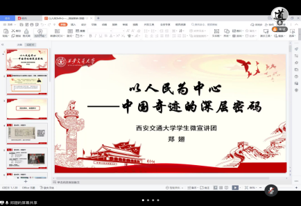 学生微宣讲团、硕0193党支部成员郑翅同志围绕“以人民为中心——中国奇迹的深层密码”的主题,为与会人员带来一场精彩的主题党课。她以优秀党员李保国、张桂梅、黄诗燕为例,讲述了我党“为人民而生、因人民而兴”的初心使命,勉励大家坚定信念,永固初心,担当使命。
