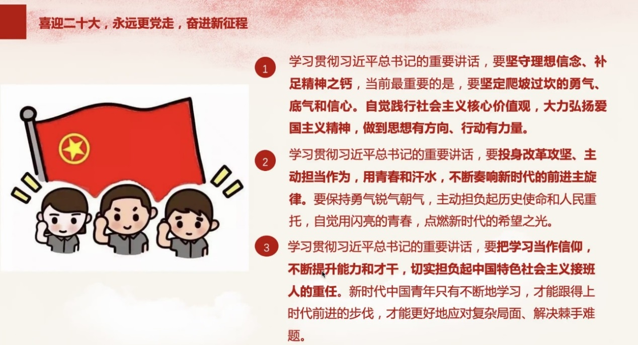 会议最后,与会同学进行了积极充分的讨论,大家纷纷表示,在新的征程上,自己将铭记初心使命,立大志,开新篇,保持心态积极向上,让奋斗成为青春最厚重的底色,用行动书写人生华章。